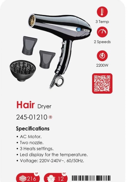 قوة عالية: يتميز بمحرك قوي يوفر تدفق هواء قوي لتجفيف الشعر بسرعة وفعالية، مما يوفر الوقت خاصة للأشخاص ذوي الشعر الكثيف أو الطويل.