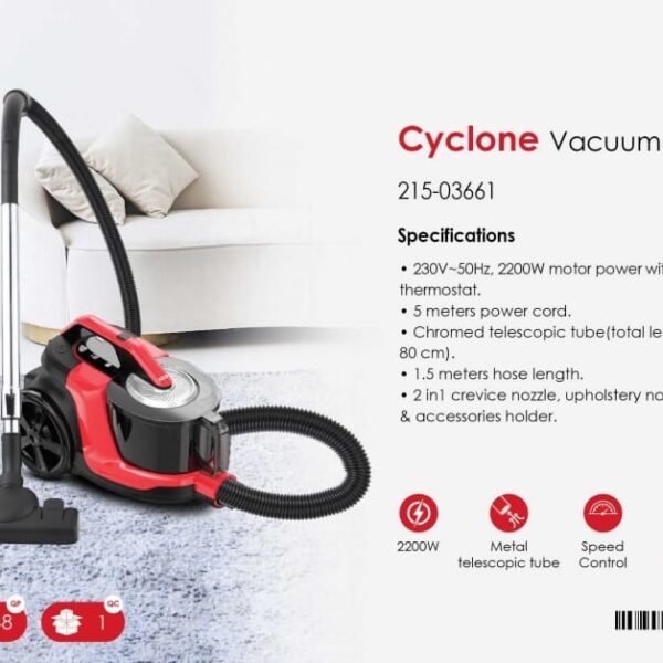 مكنسة CYCLONE VACUUM CLEANER 215‑03660 هي الحل الأمثل لتنظيف المنزل بفعالية وأمان. تتميز بتصميم عملي وتقنية شفط قوية، ما يجعلها مثالية لإزالة الغبار، الشعر، والأوساخ عن الأرضيات والسجاد والمفروشات بسرعة وسهولة.